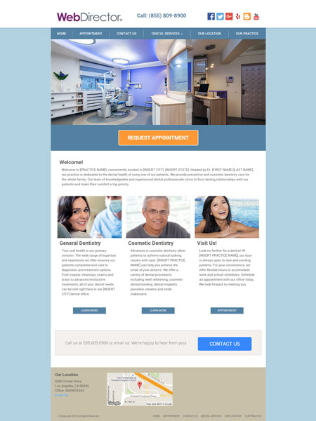 WebDirector lets you choose from over 35 dental website designs. Our templates are easily customizable to give your practice a unique, completely modern web presence. Change colors, text and photos however you like. No special technical expertise is required. And, it costs nothing extra for your new, custom design to appear on your mobile site and social media pages. Need help updating your website? We can do it for you at no extra charge.